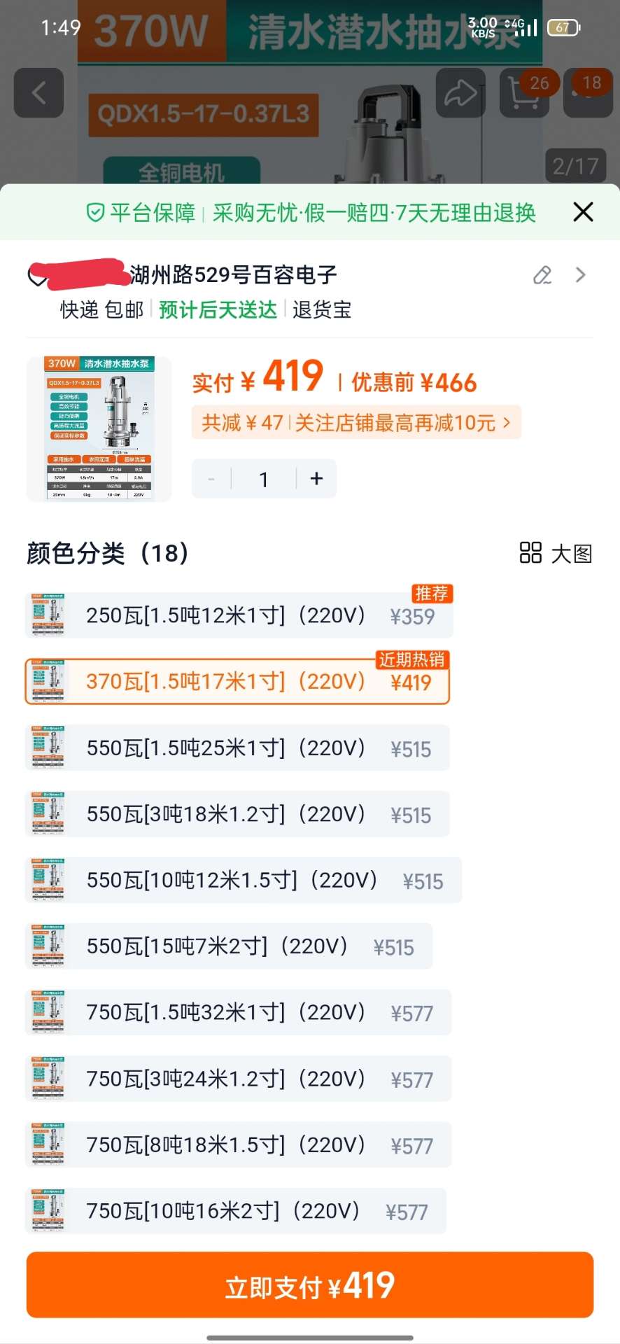 370瓦精品水泵(全新)未使用